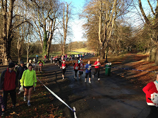 Then along came the Jingle Bells 5k in Phoenix Park. I kept doing the same number of runs/workouts per week, some of the runs were intervals/tempo runs, but no great weekly distance. I was going to run with my OH to pace her as such, but the night before the race she decided she was going to use the iPod for the duration. That was my queue to do my own thing.