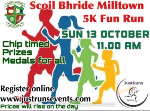 Scoil Bhríde Milltown's 5K Fun Run Date: Sunday 13th October 2019 Start Time: 11.00 am Scoil Bhríde Milltown is very excited to launch this wonderful event, the very first of its kind in Milltown. It promises to be a most memorable fun 5k event for runners walkers and crawlers Chip timed by JustRuns Events Finishers medal for all participants Prizes for 1st Male, 1st Female & 1st Under 16 Under 3 and Playschoolers free Light refreshments will be provided after…