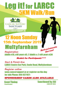 Leg It! for LARCC – 5km Walk / Run In aid of Cancer Support Sanctuary LARCC On Sunday 15th of September LARCC will host our annual 5km fun walk / run from our grounds in Multyfarnham. Registration from 11.00am. Registration: Adults €15, U18 years €5, 2 Adults & 2 u18 years €30 Start & Finish: LARCC Centre Car Park, Coole Road, Multyfarnham Event to be timed and is AAI sanctioned.