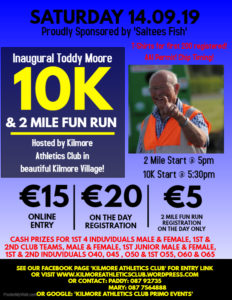 In 2018 Kilmore Athletics Club lost a club legend after the passing of Toddy Moore. Toddy served as Chairman of Leinster Athletics, was an Honorary Life Vice President of Athletics Ireland, Secretary of Kilmore AC for 42 years, Secretary of Wexford Athletics and President of both Wexford Athletics and Kilmore AC. Toddy was also an accomplished athlete winning multiple county and Leinster titles. So this year, 2019, we want to rename our annual 10k in honour of Toddy. The race…